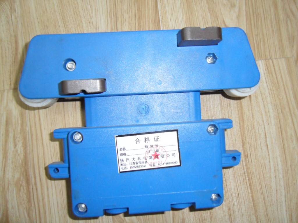在图2、图3中为了可以从母线槽10的开口9中装入,组装后的集电器1厚度略小于母线槽开口9的宽度,集电器装入母线槽时,先向上插入到位后向右旋转90°即可,这种安装方式保证了在装入时,顶面的接地保护触块6先与接地母排接触,两侧的导电触块2后与导电母排接触。拆下时则先反向旋转90°后向下拿出,保证了先切断导电触块2的接触,后切断顶面的接地保护触块6的接触。
