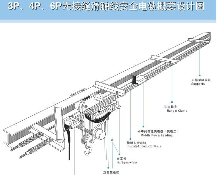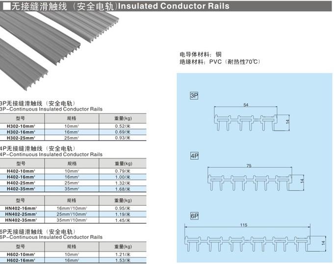 无接缝滑触线采用先进技术生产,3极、4极、6极无接缝滑触线,具有永不断电,以无氧铜输送电源,压降力,导电率倍佳,接触性好、方便安装、不易磨损、更换方便,运输更方便,不易引起滑触线损伤,延长使用寿命。产品工艺先进,做工精细,造型美观,实属起重行业系统的理想换代产品,广泛吸取科技精华,锐意进取,开拓创新,产品已形成系列化,标准化,并且可按用户要求特殊设计制造。