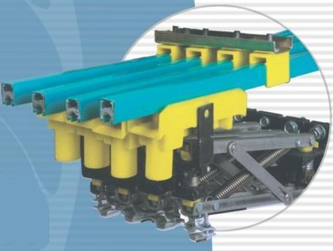 300A单极滑触线单极组合式滑线具有运行速度快、载流量大、耐温性能优良等特点,其防护等级可达IP23。铝质滑线导轨内腔顶部与集电器接触面采用冷压焊技术,把不锈钢带与铝导线复合成一体,以避免铜铝接触的电腐蚀性并能增强接触的耐磨性能,其寿命可以达到10年以上。导线与集电器接触面做成“V”形槽,保证了集电器运行的平稳性。