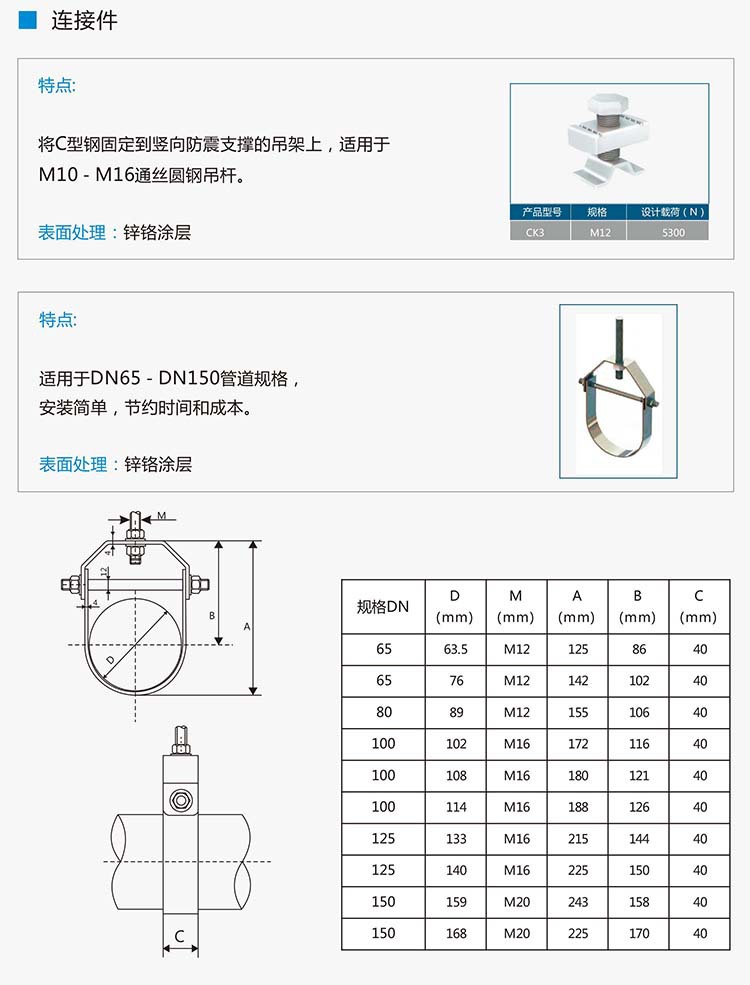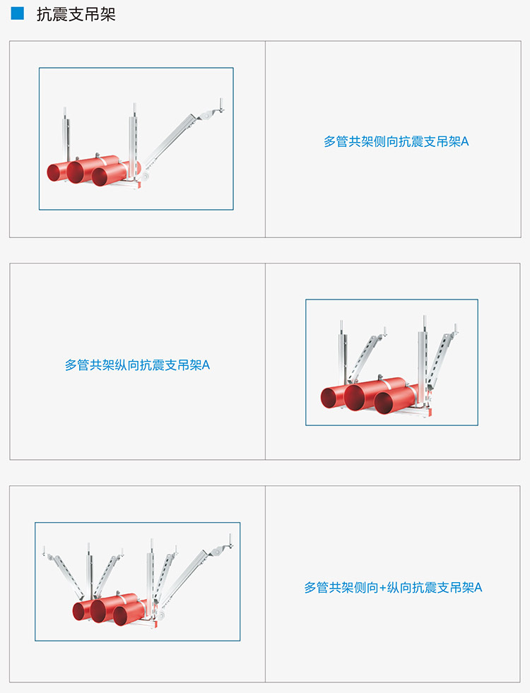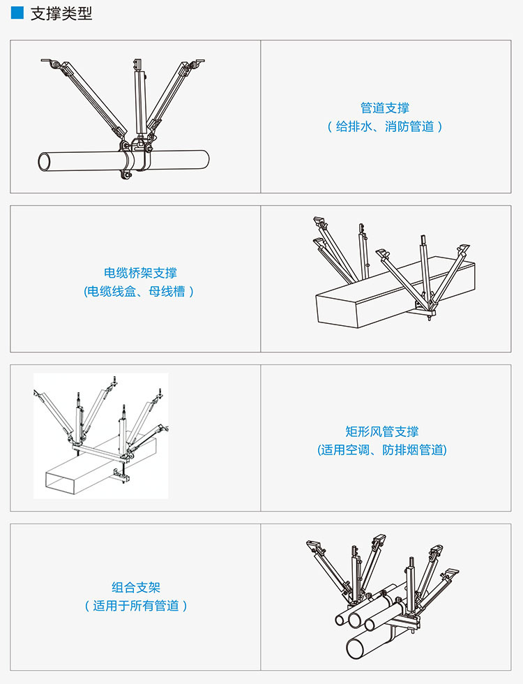 可以通过相关构件快速有效地与钢结构、混泥土等结构主体进行连接,组合成多种形式的成品支吊系统或抗震支吊架系统。