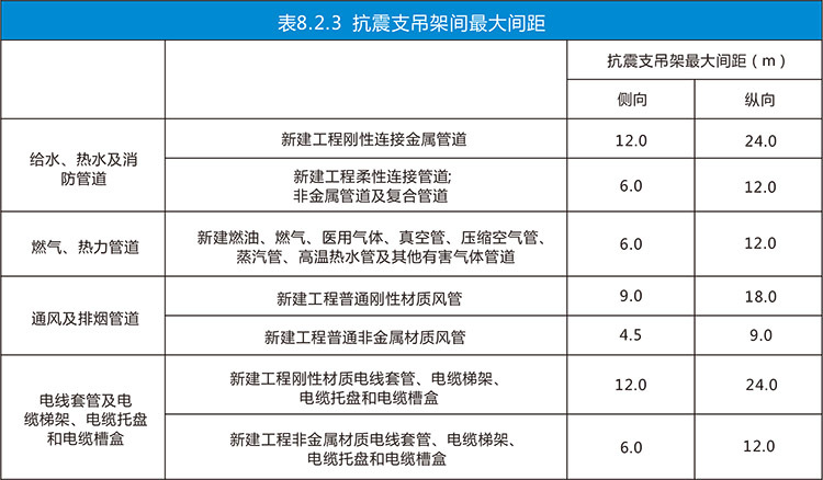 风、水、电等专业抗震支吊架间距按照《规范》表8.2.3选择。