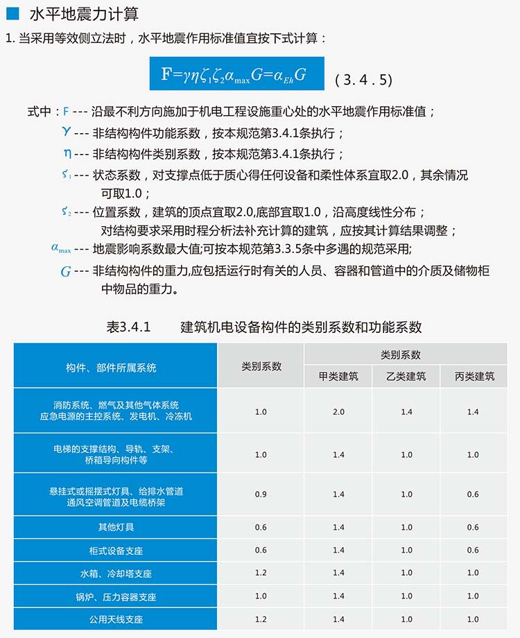 2015年8月1日实施的国家标准GB50981-2014《建筑机电工程抗震设计规范》其中“第1.0.4、5.1.4、7.4.6”条为强制性条文,必须严格执行。国家《建筑机电工程抗震设计规范》第1.0.4强制性条文规定“抗震设防烈度为6度或6度以上地区的建筑机电工程必须进行抗震设计“;建筑机电专业具体要求如下:
